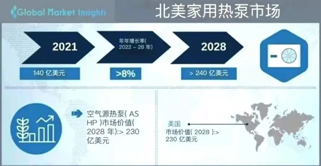 日前,全球市场研究和管理咨询机构发布了《北美户式热泵市场报告》,报告中提到,北美户式热泵市场规模预计2028年将达到245.936亿美元,而其中空气源热泵增长最快,预计到2028年将超过230亿美元。
