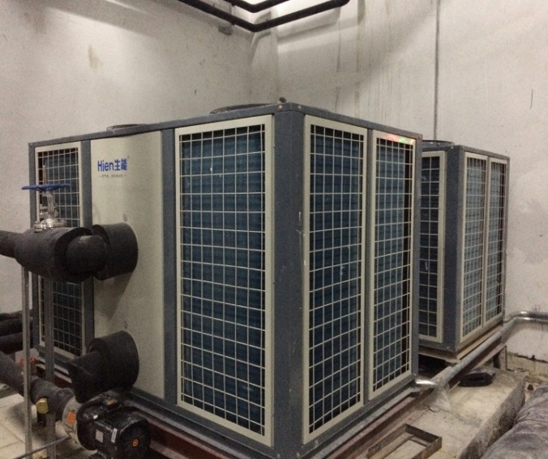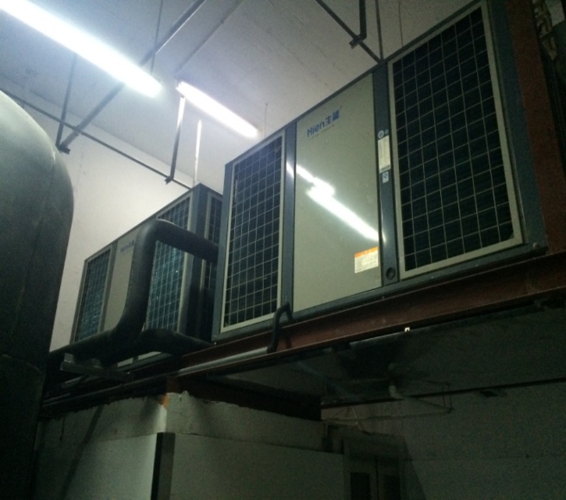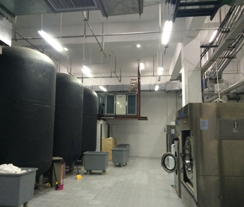 采取承压水箱,充分发挥康都公司的技术优势,利用康都公司锅炉和空气能连接机构的专利技术和理念,将空气能热泵机组安装在洗衣房和水泵房,在制取热水的同时,将冷源输送至配电房、洗衣房等高温场所,进行冷热源的完美利用结合,冷源二次利用。
